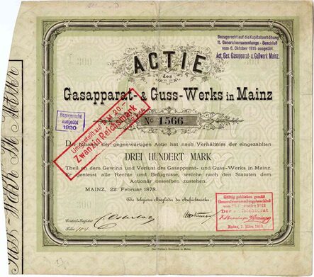 Auf den Inhaber ausgestellte Aktie mit der Nummer 171 im Nennwert von 1.000 Mark Reichswährung. Format: 21,7 cm x 34,6 cm. Das ursprüngliche Emissionsvolumen belief sich auf 600.000 Mark. Ab 1922 wurden die Aktien an den Börsen in Frankfurt a. M., München, Köln, Genf und Basel gehandelt. Stempelaufdrucke zeigen die Ausübung von Bezugsrechten und die Umstellung auf den Wert von 40 Reichsmark. Die Aktie zeigt die Unterschrift von Ferd. Sichel und wurde bei E. M. Mayer in Mainz gedruckt.