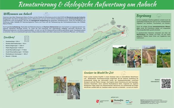 Die Erd- und Wasserbauarbeiten starteten im Oktober 2024 im Bereich zwischen „Am Elmerberg und Altem Wasserwerk“ in Mainz-Finthen und wurden Ende Februar 2025 fertig gestellt. Dabei wurden u.a. Betonrinnen entfernt und flachere Uferbereiche als Überflutungsflächen angelegt. Auf der Südseite des Aubachs wurden 2018 Ufergrundstücke von der Landeshauptstadt Mainz erworbenen und genutzt, um Aufweitungen, Inseln und wechselfeuchte Zonen mit entsprechender Initialpflanzung, also gezielter Erstbepflanzung von heimischen Arten anlegen zu können. Diese Pflanz- und vegetationstechnischen Arbeiten, wie die Pflanzung von standortheimischen Wiesen- und Weichholzarten, folgte im Anschluss an die Erd- und Wasserbauarbeiten bis Anfang Juni 2025.