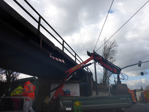 Ein LKW war im Kreuzungsbereich Hattenbergstraße/Mombacher Straße mit seinem Ladekran zunächst in der Oberleitung der Straßenbahn hängen geblieben. Hierbei riss er die Oberleitung auf einer Länge von ca. 200 Metern aus der Verankerung, so dass diese teilweise auf der Straße lag. Der Verursacher fuhr danach aber noch einige Meter weiter, bis er an einer Eisenbahnbrücke anstieß. Durch die Wucht des Aufpralls wurde das Fahrzeug vorne hochgehoben und gegen die Unterseite der Brücke gedrückt. Hierbei wurde das Fahrerhaus schwer beschädigt. Der Fahrer war während der Rettungsmaßnahmen ansprechbar.