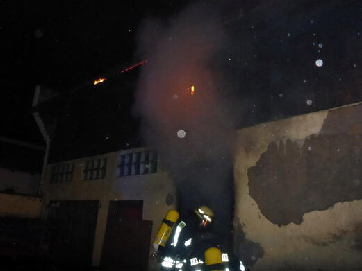 Beim Eintreffen der Einsatzkräfte konnte eine starke Rauchentwicklung und Flammenschein aus einem Fenster und im Bereich der Hauseingangstür eines zweigeschossigen Nebengebäudes festgestellt werden. Zu diesem Zeitpunkt war unklar, ob sich noch Personen in dem Gebäude befinden.