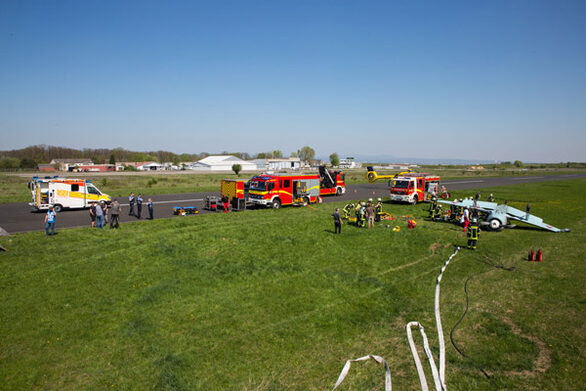 Bereits auf der Anfahrt wurde per Funk mitgeteilt, dass ein Kleinflugzeug beim Landeanflug auf den Grünstreifen neben der geteerten Landebahn abgekommen sei und sich hierdurch überschlagen habe und nun kopfüber auf der Wiese liegen würde. Der Pilot sollte in der Maschine eingeklemmt sein.