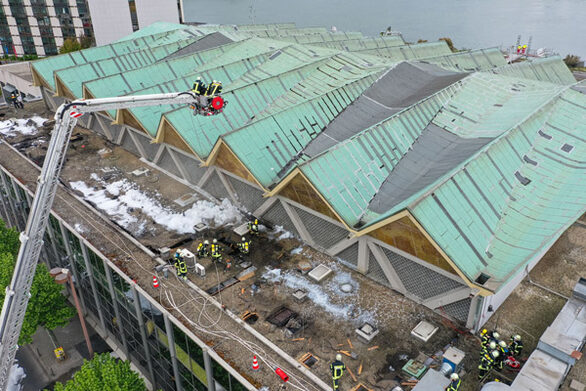 Als besondere Herausforderung für die Feuerwehr stellte sich die Dachkonstruktion heraus. In dem Holzfachwerk zwischen tragender Stahlbetondecke und Dacheindeckung hatte sich das Feuer weit ausgebreitet. Das Öffnen der Dachkonstruktion gestaltete sich als äußerst zeit- und materialintensiv. Weiterhin musste auf Grund der starken Rauchentwicklung unter Atemschutz gearbeitet werden. Das Dach konnte dabei nur eingeschränkt und unter Verwendung von Absturzsicherung betreten werden, da immer wieder Teile der Dachkonsturktion einstürzten. Zeitweilig waren sieben Hubrettungsfahrzeuge/ Drehleitern um die Rheingoldhalle positioniert, um das Feuer bekämpfen zu können.