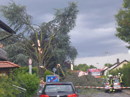 Rund um den Harxheimer Weg stürzten viele Bäume um, die Einsatzstellen wurden erkundet und teilweise abgesperrt.