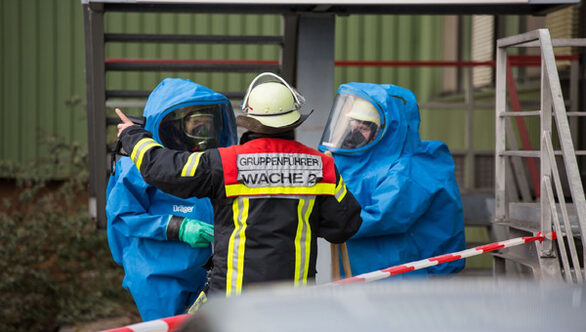 Ein mit Vollschutz ausgerüsteter Trupp erkundete, ob Explosionsgefahr bestand und welcher Stoff in welcher Menge ausgetreten war. Glücklicher Weise stellte sich heraus, dass keine größeren Gefahren bestanden und auch nur eine geringe Menge ausgetreten war. Der Gefahrstoff wurde mit einem speziellen Bindemittel aufgenommen und gesichert. Begleitend wurden Sicherheitsmaßnahmen für den vorgehenden Trupp ergriffen und Recherchen zur Art des Stoffes durchgeführt.
