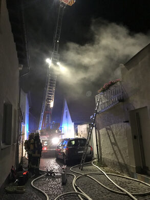 Vor Ort bestätigten sich die Angaben des Anrufers. Die Rauchentwicklung hatte sich bereits auf der gesamten Straße ausgebreitet. Durch ein Kellerfenster waren Flammen zu erkennen und bedingt durch die ältere Bauweise kam der Rauch aus mehreren Öffnungen des Gebäudes. Die Eigentümer des Gebäudes retteten sich mit ihren Kindern vor Eintreffen der Feuerwehr bereits selbst auf einen Balkon. Mit Hilfe der Nachbarn stiegen sie anschließend über eine Leiter zu Boden. Umgehend leiteten zwei Trupps unter Atemschutz die Brandbekämpfung ein und kontrollieren die Räume auf weitere Personen oder Brandherde. Parallel wurden das Gebäude mittels Hochleistungslüfter entraucht.